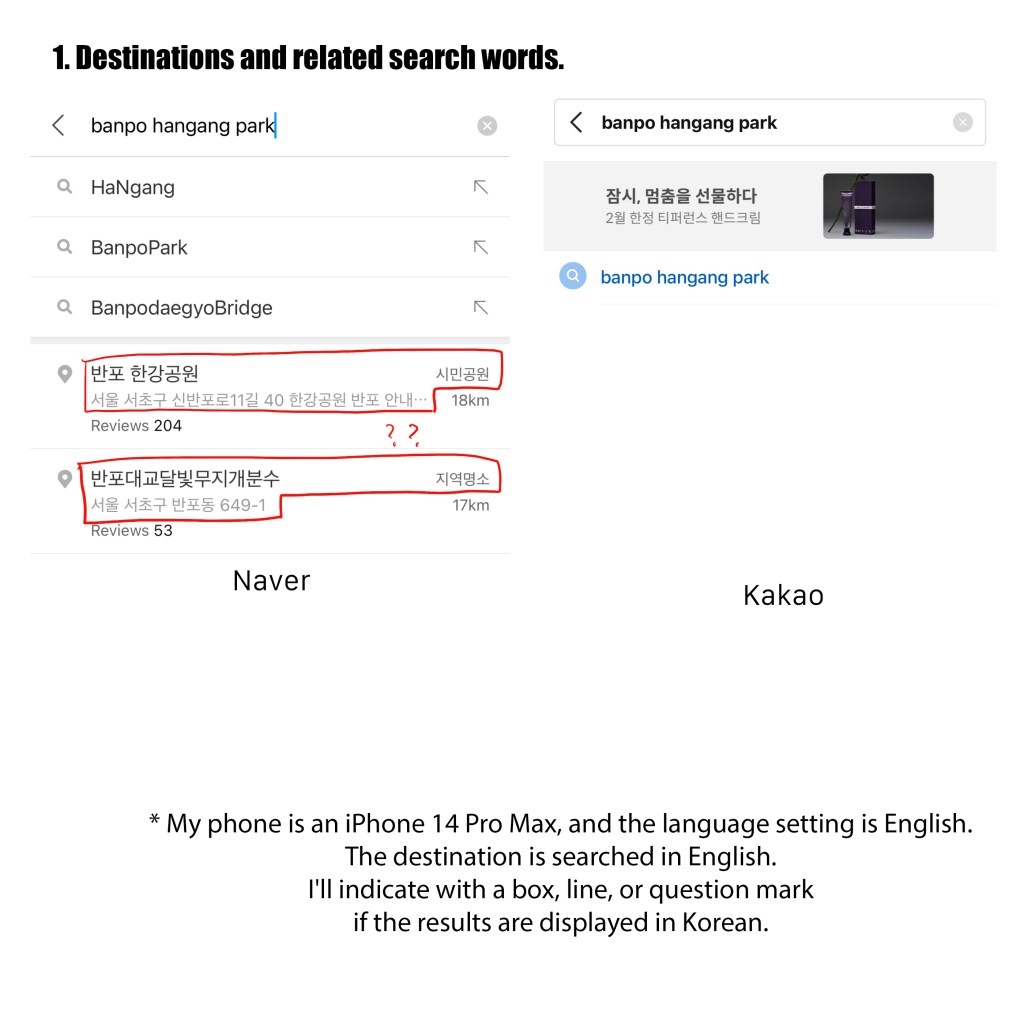 * My phone is an iPhone 14 Pro Max, and the language setting is English. The destination is searched in English. I’ll indicate with a box, line, or question mark if the results are displayed in Korean.