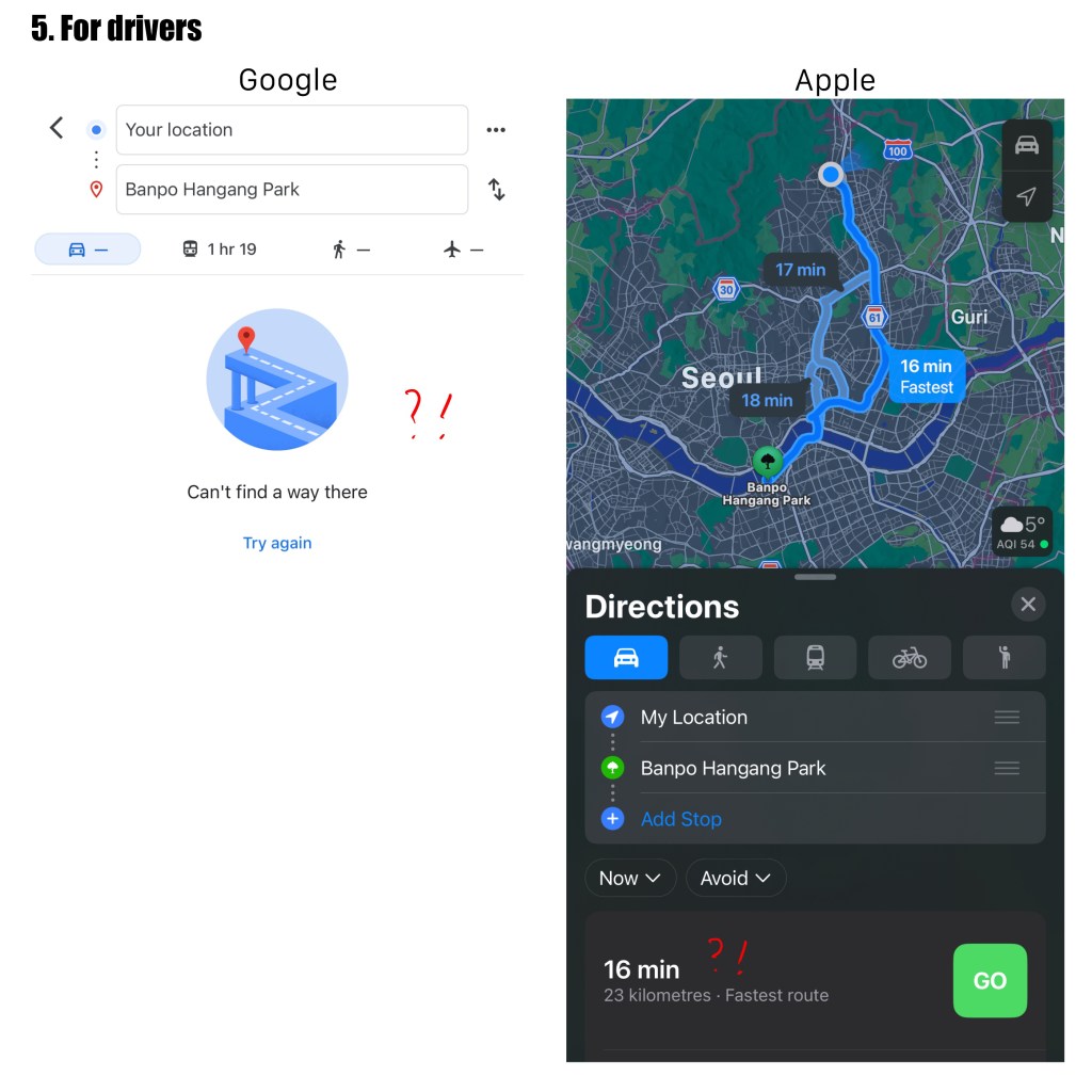Google seems to work well for walking tourists. I’m writing this in a cafe located on the edge of Seoul, but it didn’t show any route from here to Banpo Hangang Park for driving a car. Apple shows the best route, but their estimated time is about 30 minutes different from the Korean app. They don’t seem to consider traffic on the road.
