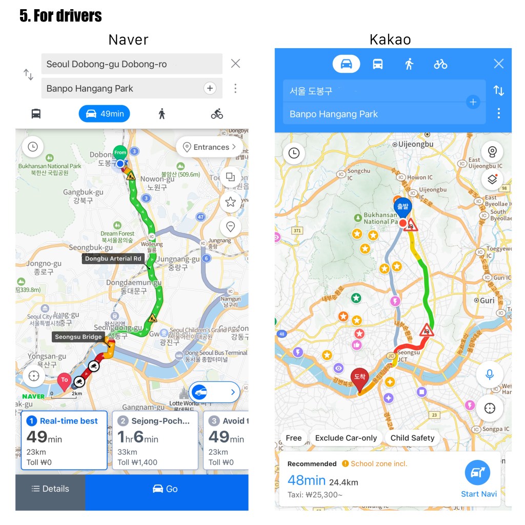 Most Korean drivers, especially taxi or bus drivers, prefer Naver. But I recommend Kakao if you’re considering riding in a taxi because they show estimated taxi fares. Additionally, Kakao has its own taxi-calling app.
