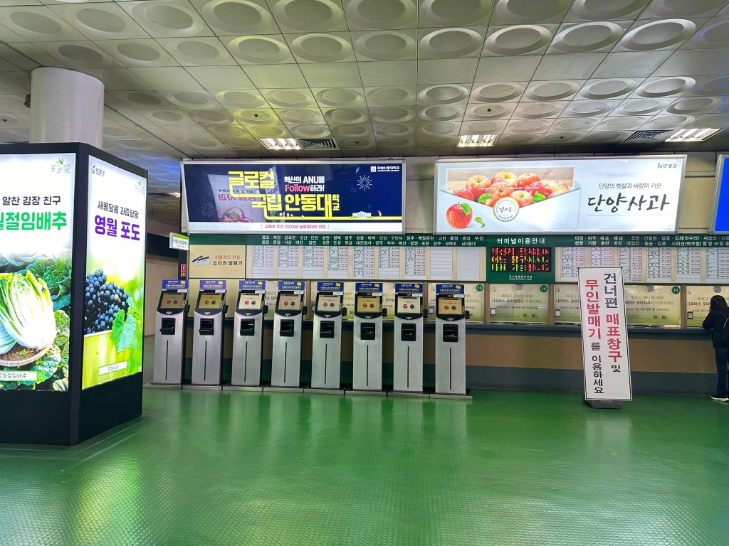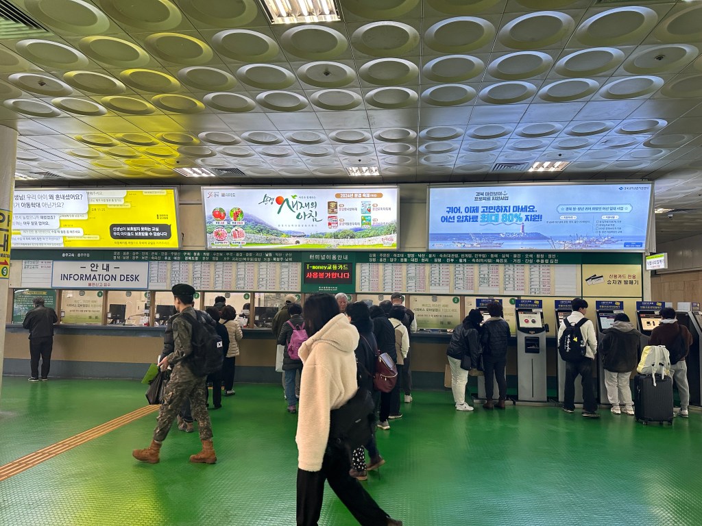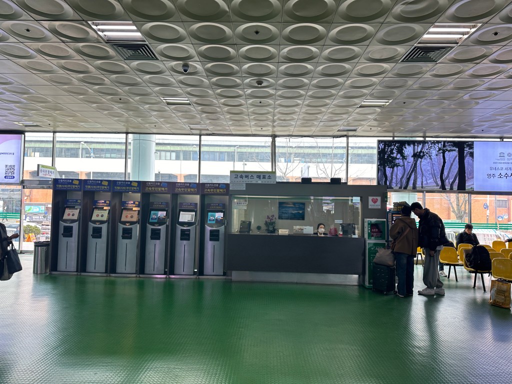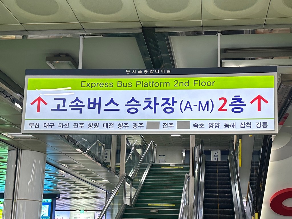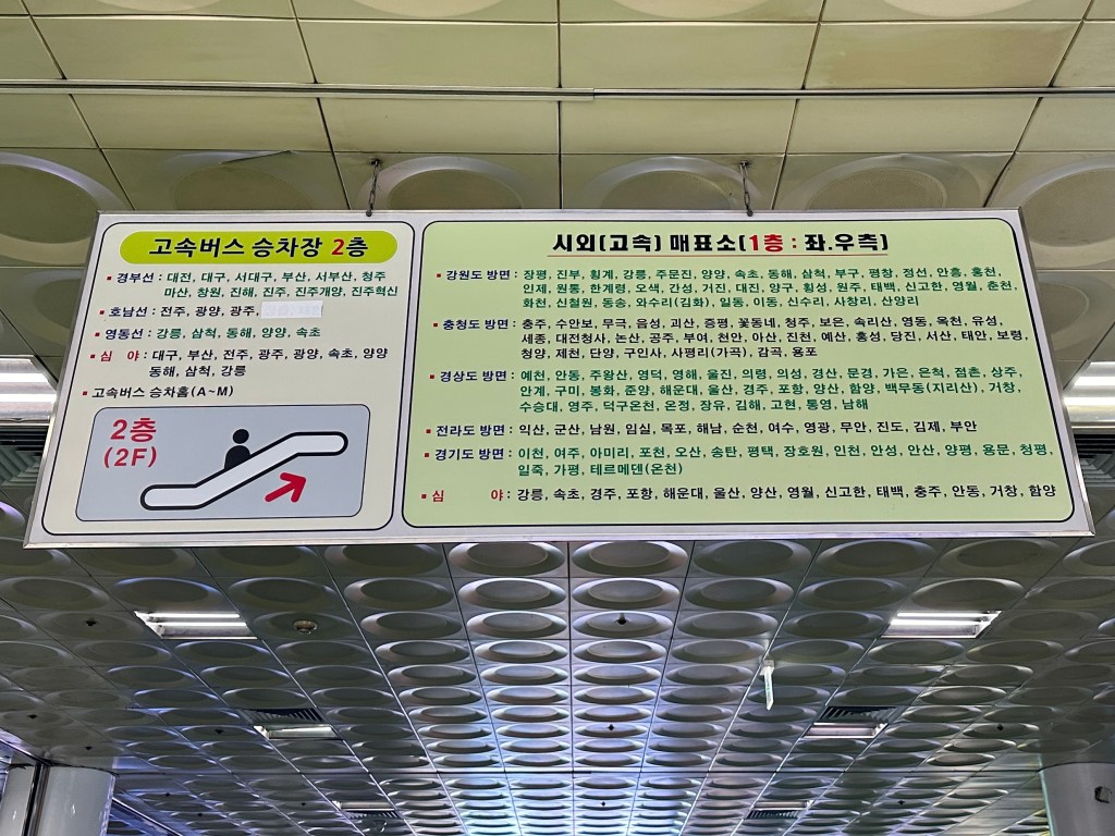It also offers 14 destinations for express buses. So it can be a bit confusing for people as the ticket booths are separated. The ticket booth for express buses is located right next to the entrance, clearly marked. If you prefer to buy your bus ticket from a teller, they will ask you to double-check if there is an earlier ticket available at the intercity ticket booth. For destinations like ‘Gangreung,’ tickets can be purchased at both booths. However, the intercity bus may take approximately 30 minutes longer than the express bus due to making more stops. Additionally, the platforms for each type of bus are different: to board an express bus, you need to go upstairs and cross the bridge to reach its platform.