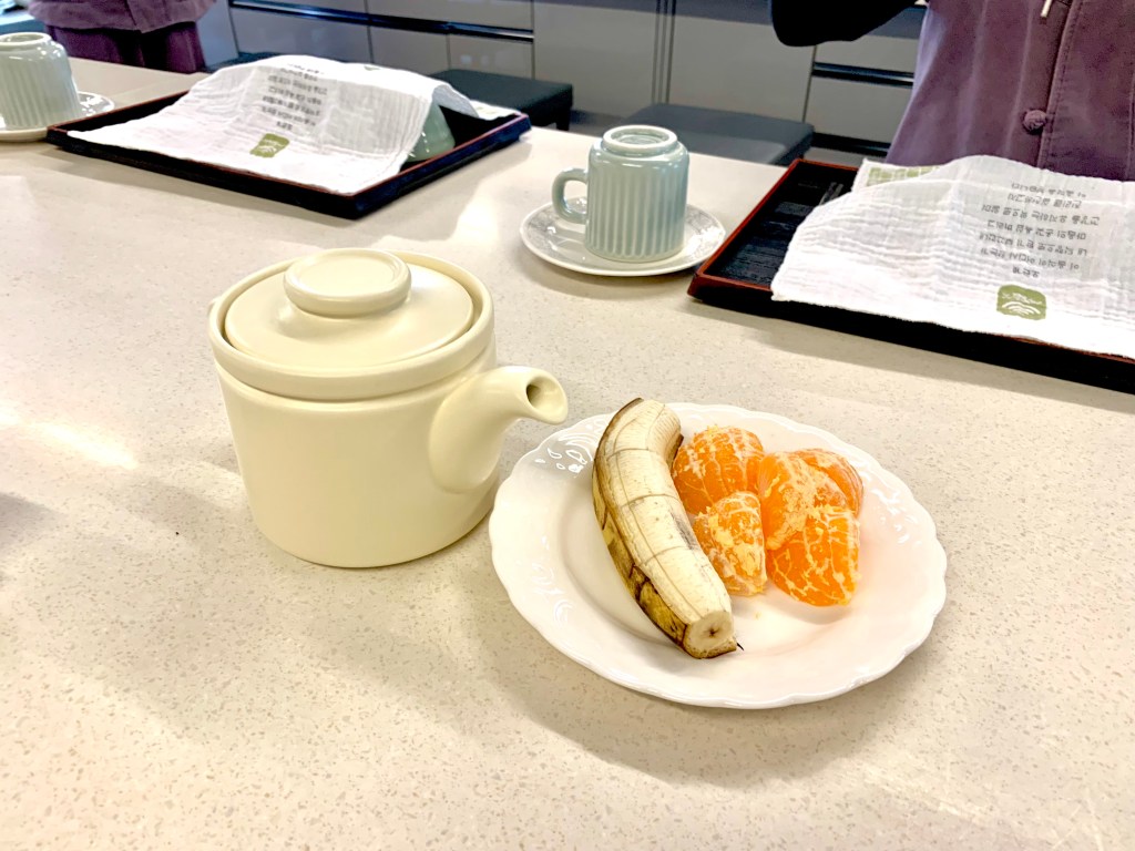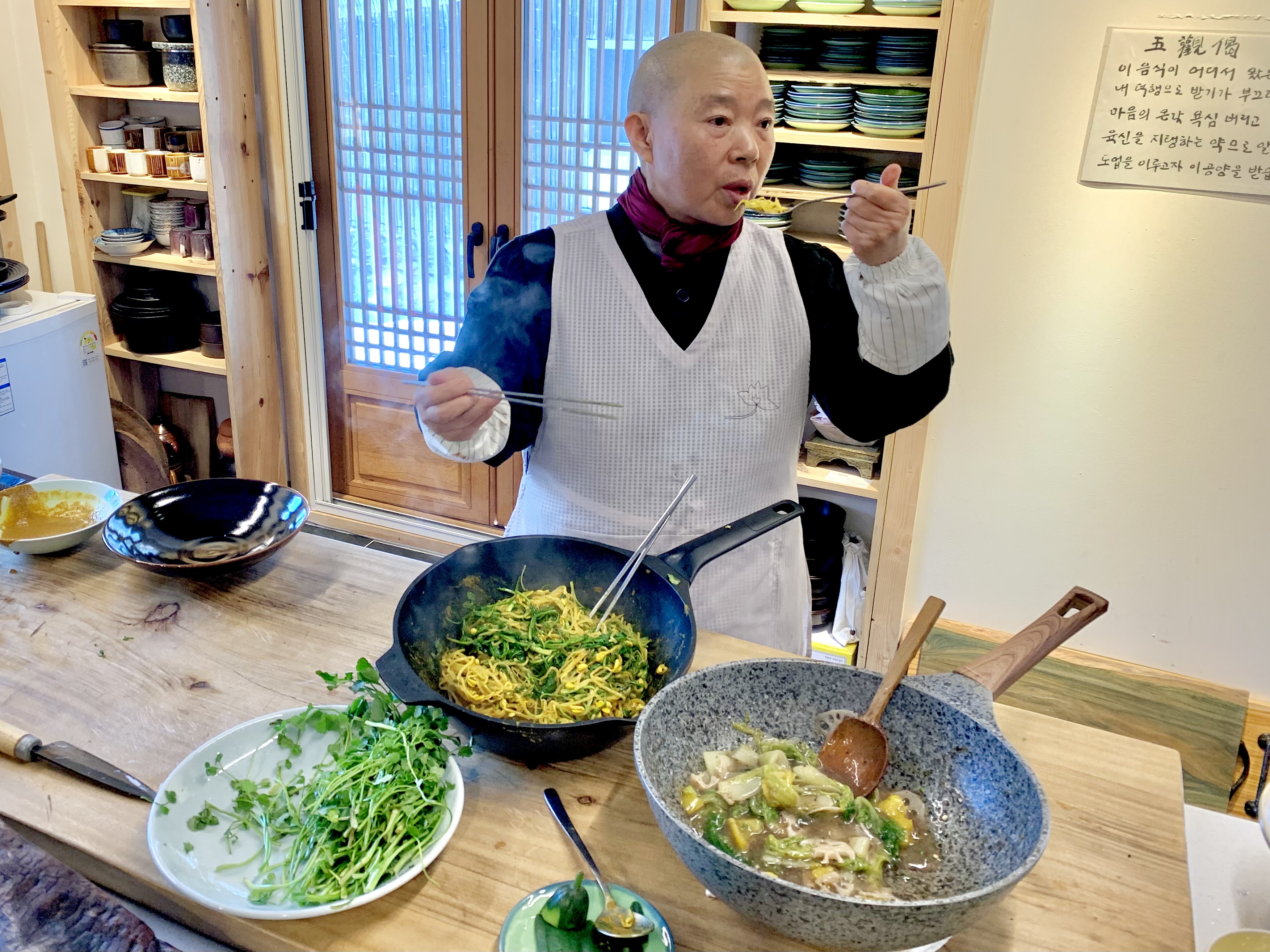 You will hike for about 15 minutes to CheonJin-Am. CheonJin-Am is a hermitage belonging to BaekYang-Sa, and its abbot monk is JeongGwan. She will serve you Korean Buddhist food cooked by her. It feels like her own cooking show. She introduces her philosophy about food based on Buddhism and Taoism. A large amount of food for people, like a mother cook for their kids. She doesn’t use OShinChae (the five pungent herbs that Buddhist practitioners should avoid, including garlic, green onion, leek, chive, and wild chive). So her food doesn’t have any pungent taste. Instead, she uses other herbs from around the world, like turmeric, which gives the food a taste that is a bit different from traditional Korean dishes. All the ingredients are picked by herself. I understand she tries to avoid any kind of artificial treatment like spraying pesticides or herbicides. The ingredients are all seasonal vegetables, which stimulate our appetite. Finally, she serves tea that she has roasted herself.
