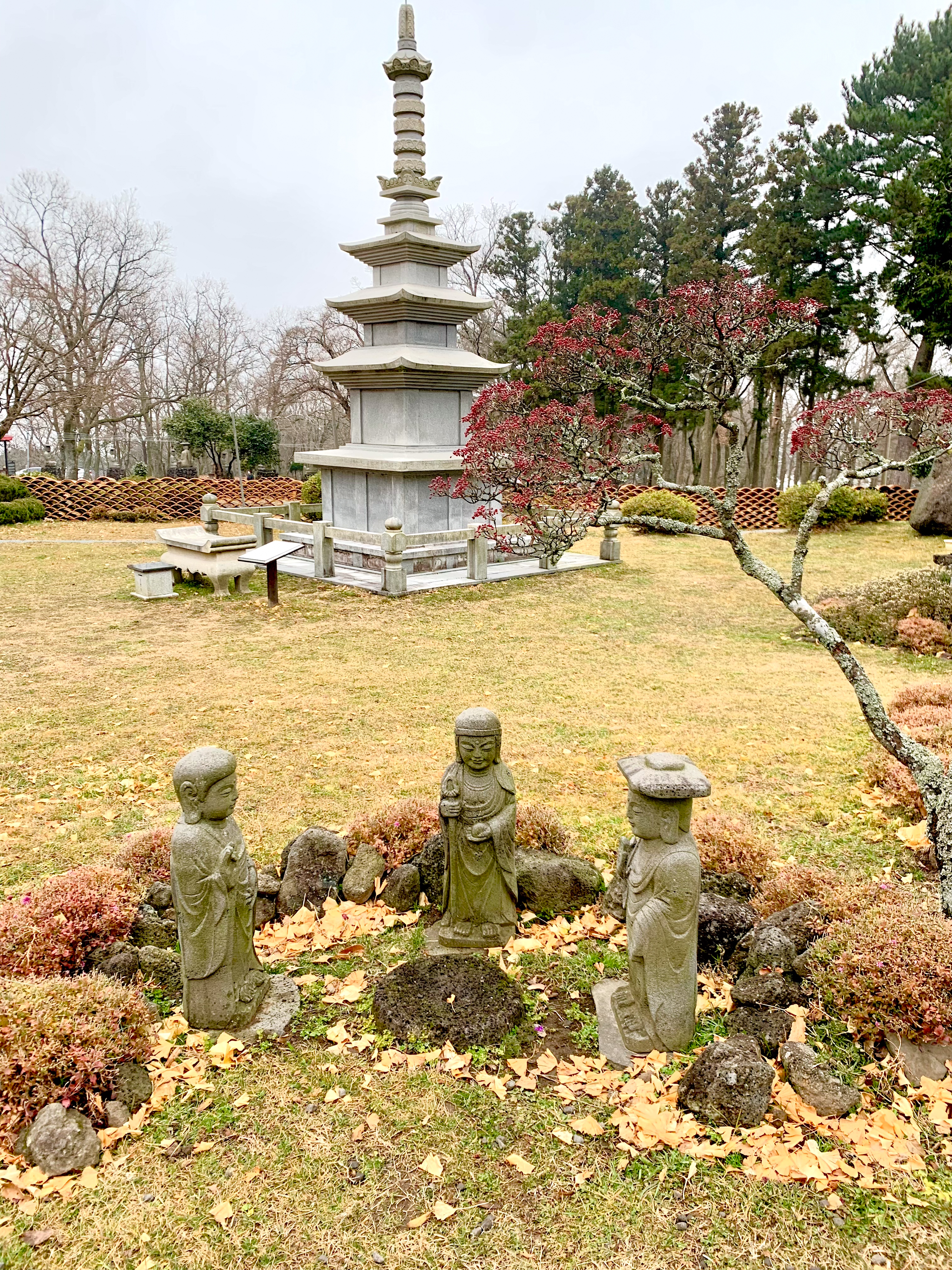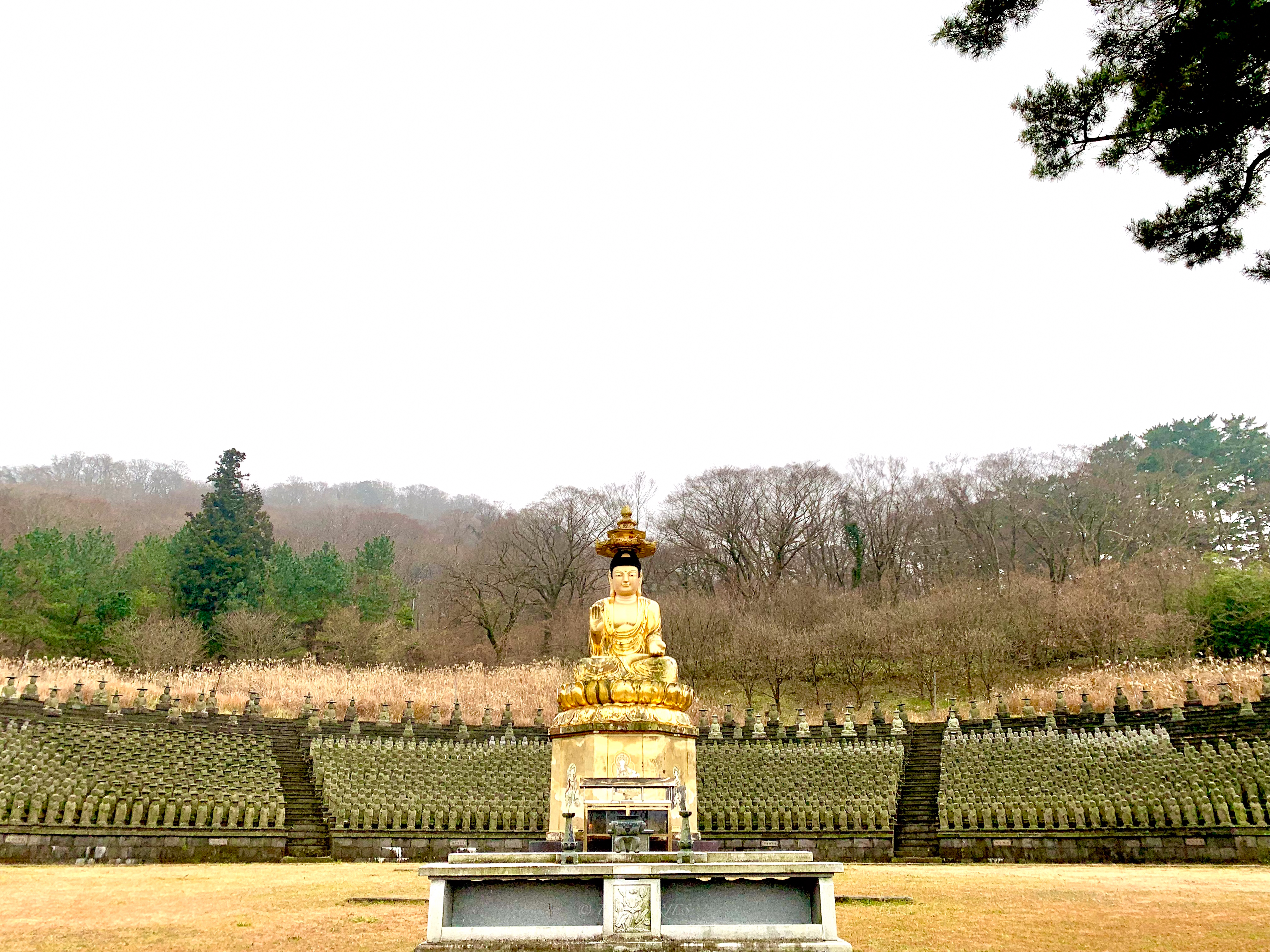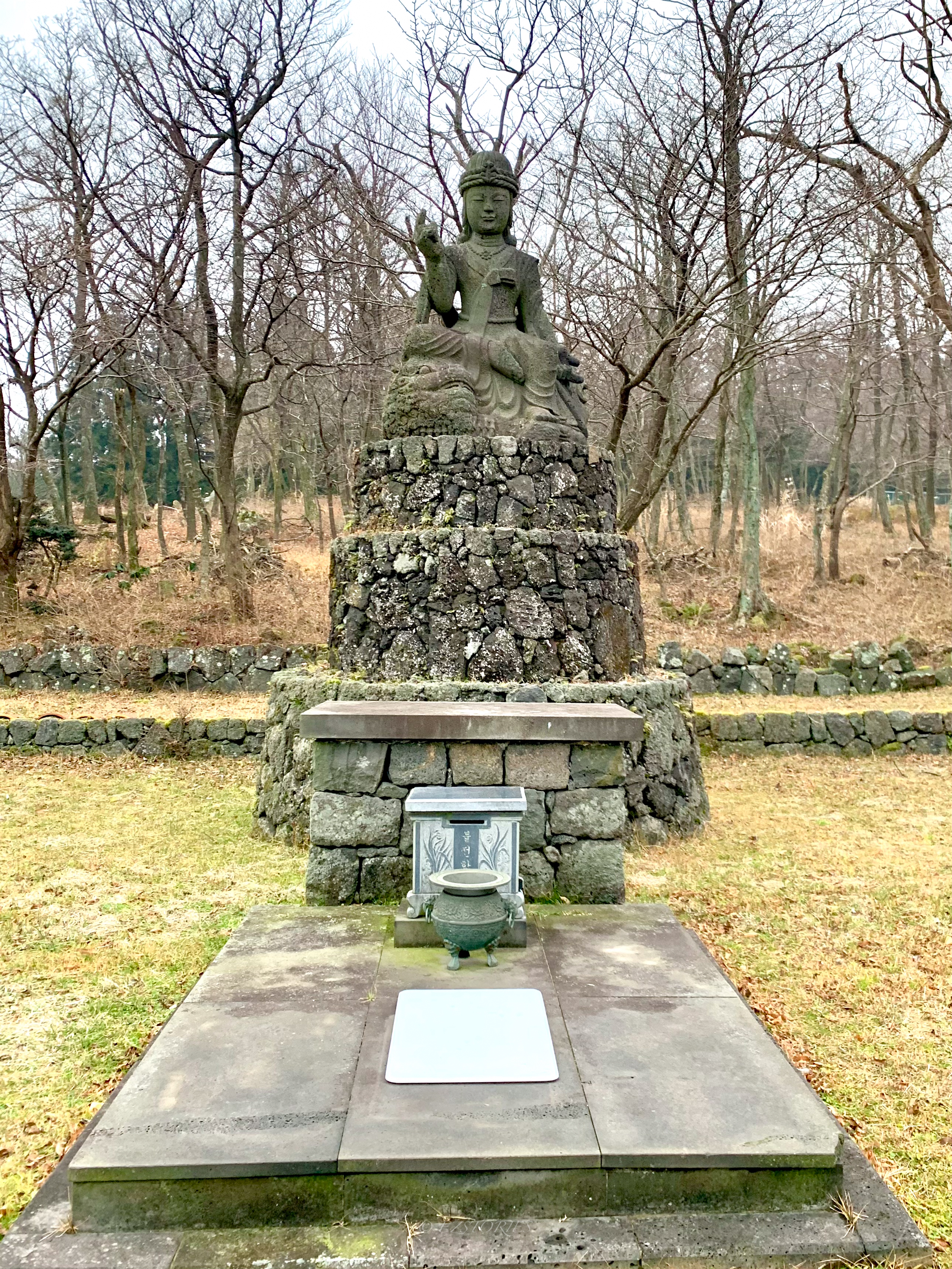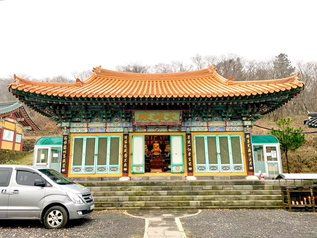 GwanEum-Sa Buddhist temple is located at the entrance of Hanra National Park. As you drive along the mountain road, with one lane in each direction, a huge square and the temple gate suddenly appear. To the left of the gate, Buddha sits on a Lotus throne, his hands forming the Dharmacakra-Mudra(The hand posture of the wheel of the great Dharma). It feels welcoming to us.