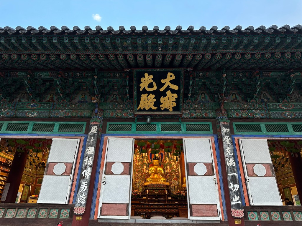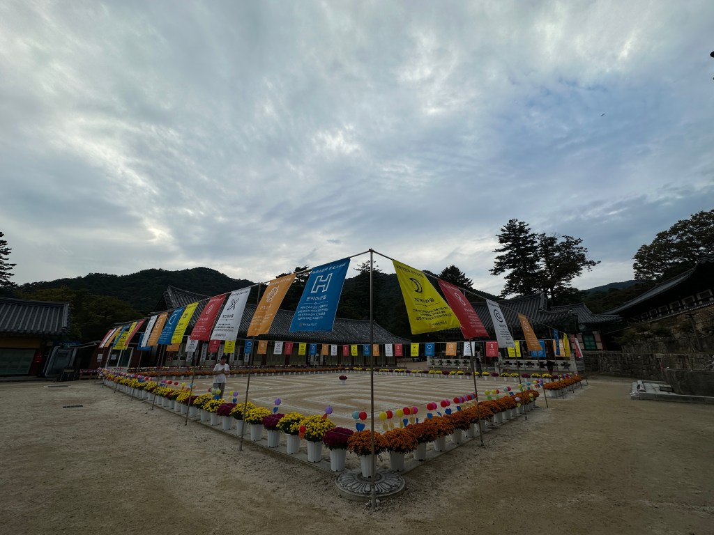 This temple uniquely reflects this concept with its walking meditation area, located in front of the book cafe. Believers walk along a special diagram installed in the square. This diagram, intricately redesigned in the shape of a swastika (卍) by the eminent Buddhist monk UiSang, represents Beopseongge (Song of Dharma Nature), a poem summarizing the core ideas of the Hwaeom-gyeong. The original Haein-do consisted of 210 characters arranged in 30 lines, with 7 characters per line.