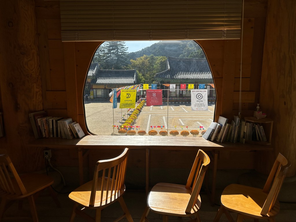 Located in Haein-sa, GooGwang-Ru Book Cafe features a distinctive circle-shaped window. This cafe offers a selection of books, coffee, and tea, providing a unique contrast between patrons enjoying their tea and the sight of believers engaging in walking meditation.