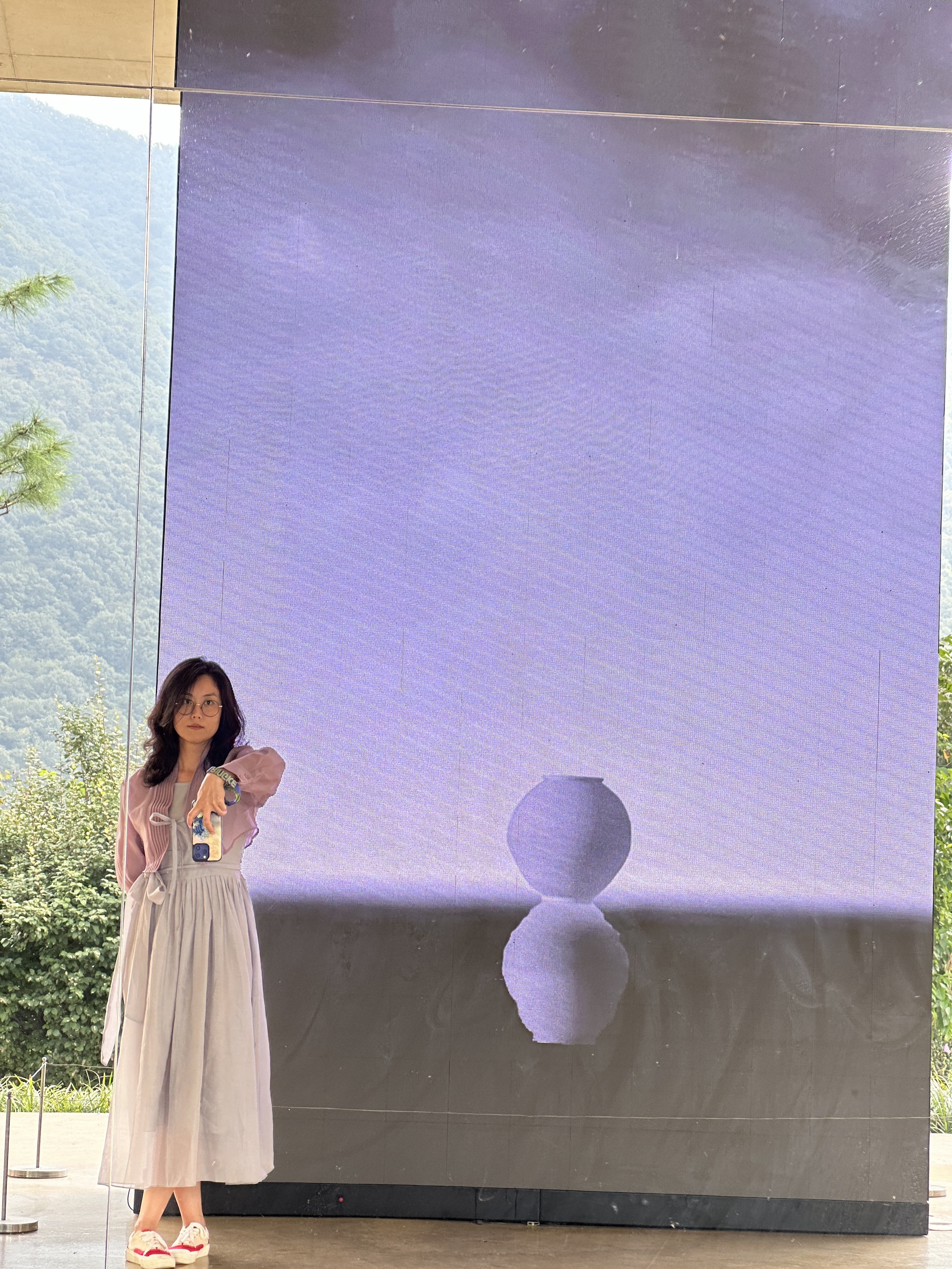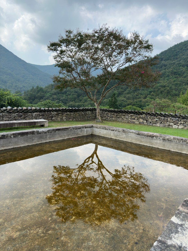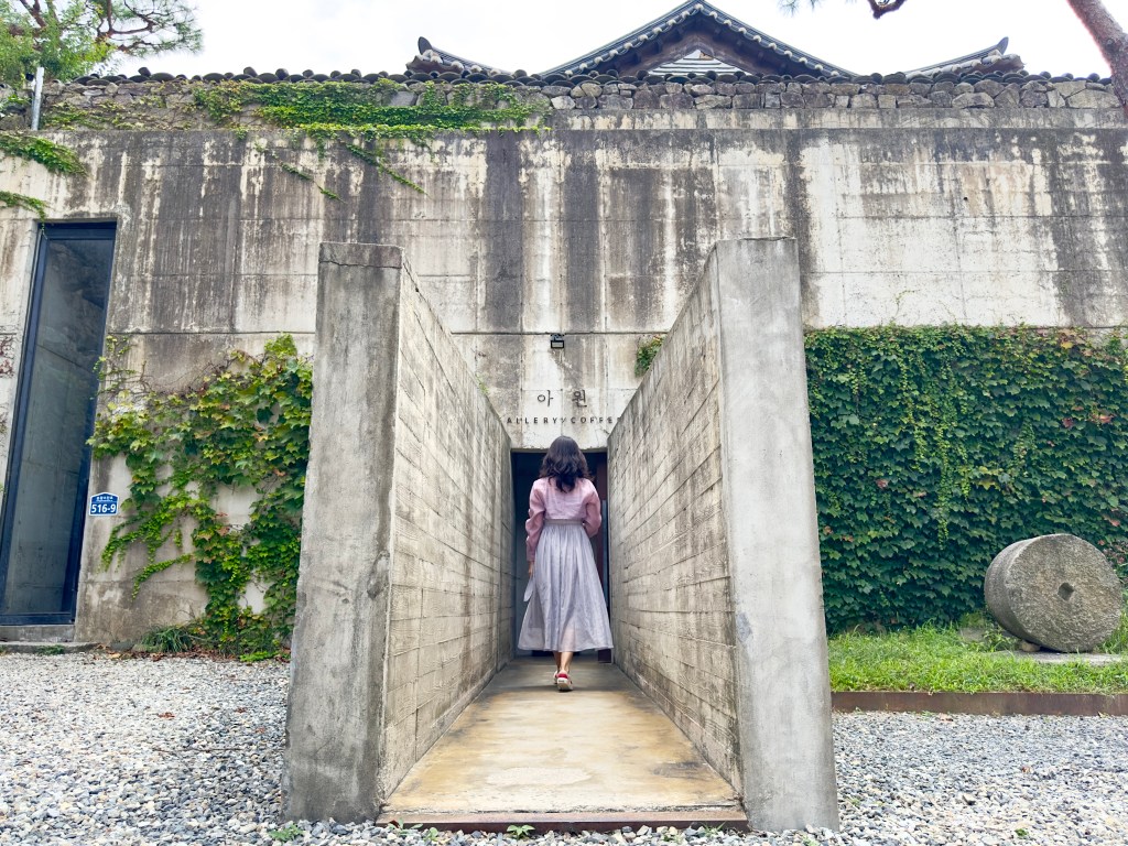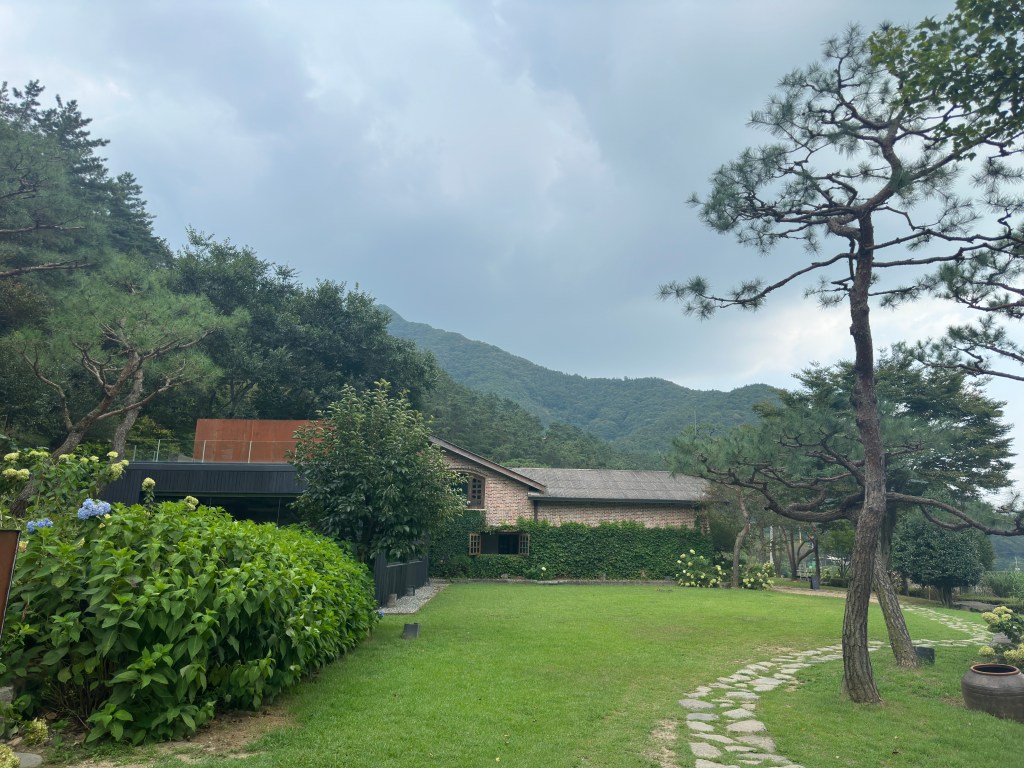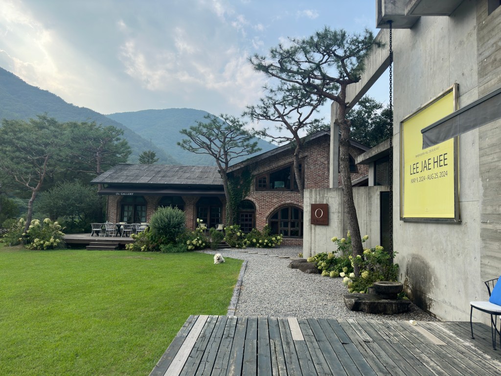 Oseong-Je Reservoir is another BTS filming location, just a 5-minute drive from Awon GoTeak. It’s famous for the iconic tree where BTS took a commemorative photo, but it also has an ecological trail around the reservoir that takes about 20 minutes one way. Along the trail, you’ll find O’s Gallery, located in the middle of the road. The owner of O’s Gallery is part of the same group as Awon GoTeak. The building was originally used for silkworm farming but has since been renovated and expanded with an exposed concrete structure, serving as both a café and a gallery managed by O’s Art Group. The moment you step into their garden, you can feel the unique charm of the owner.
