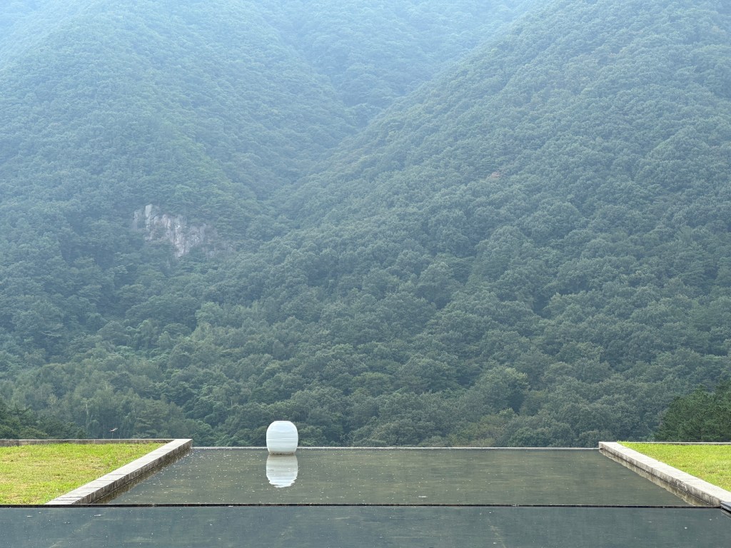 Once you descend from the bamboo forest, you must choose where to go first. To the right is the 200-year-old Seodang (a private school building), which served as a filming location for BTS. This area is highly secured and is not open to the public if there are reservations. It even has its own Hinoki open-air bath. To the left is the oldest building, originally from Jinju City in Gyeongsangnam-do, built around 1740, about 250 years ago. These structures, located in the center of the property, still function as the An-chae (inner quarters) and Sarang-chae (outer quarters). The most captivating building, Cheonjiin, sits right in front of these. The serene atmosphere of sitting on the Daecheong-Maru (open living area) while gazing at the infinity pool against a mountainous backdrop is unforgettable.